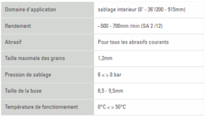 L’appareil Spin-Blast permet de nettoyer l’intérieur des tubes dont le diamètre est compris entre 8 et 36 pouces, c’est-à-dire entre 200 et 915 mm (taille selon version). Il est raccordé directement à l’appareil de sablage à la place de la buse de sablage.
